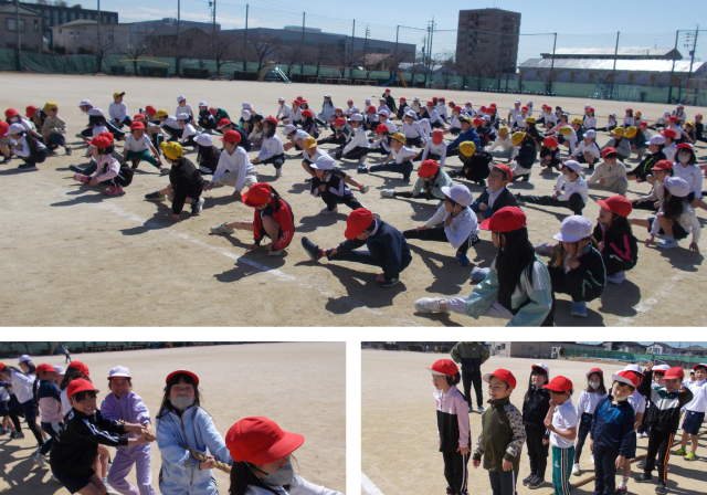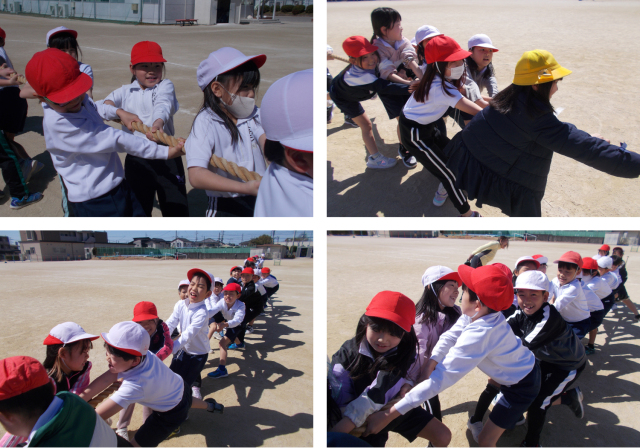 子どもたちにとって、つなひきは初めての経験でしたが、「よーい、ピー!」の合図とともに、みんなで力いっぱい綱を引きました。友達と声をかけ合いながら、精一杯がんばる姿がとても印象的でした。終わった後には、「楽しかった」「またやりたい」という声もたくさん聞かれ、笑顔あふれる時間となりました。