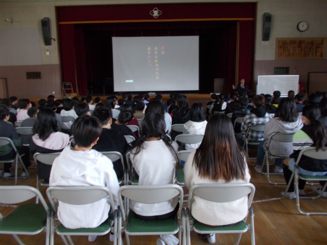 卒業式前日、教頭先生から授業をしていただきました。「夢」について、教頭先生が体操の全国大会で活躍する中で感じたこと、考えたことを教えていただきました。時に笑える場面もあり、あっという間の1時間でした。6年生の皆さん、夢に向かって羽ばたいてください。