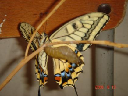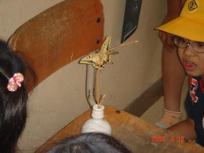 アゲハチョウの誕生 公開日 2008/06/17 更新日 2008/06/17 学校の様子 6月13日の早朝、さなぎからきれいなアゲハチョウへ変身です。 3年生が、理科の「昆虫」の学習で観察していたアゲハです。 早朝に羽化したアゲハが、くしゃくしゃの羽根をぴんと美しく伸ばし終えた頃、子どもたちが登校。発見! 自分から大空へ舞い立つまでの数時間、子どもたちの人気者でした。