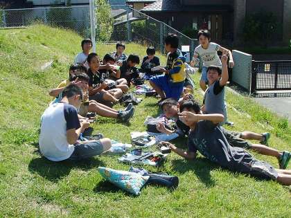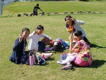今日は1〜5年生が遠足で出かけているので、学校には6年生だけです。給食がないので、外の思い思いの場所でお弁当を食べていました。つかの間の遠足気分を味わっているようで、楽しそうでした。