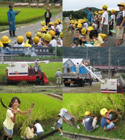 5年生は、総合学習で「稲を育てよう」という取り組みをしています。10月7日(火)には、稲の育て方について、今まで教えていただいた農業委員の川地隆正さんの田んぼに出かけ、実際に稲刈りをする場面を見学させていただきました。コンバインで能率良く刈り取られていく中、少しだけ鎌を使って、刈り取らせていただきました。