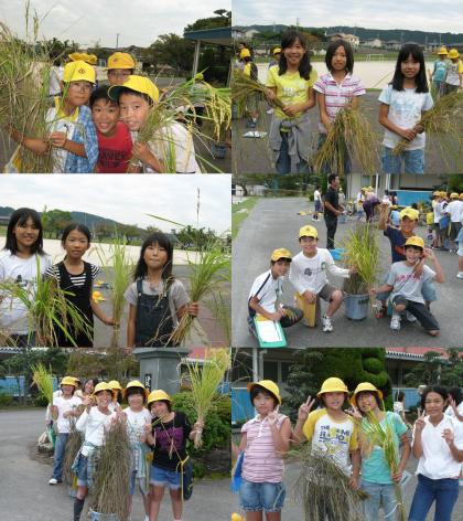 学校に戻ってからは、学校で育てたバケツの中の稲を刈り取りました。この稲も、川地さんが5月にくれた苗を、みんなが順番に水やりをしながら育てたものです。おいしいお米ができることをみんな期待しています。