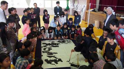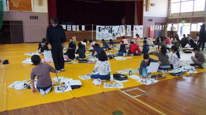 あ〜とふるマイタウン事業 公開日 2015/11/06 更新日 2015/11/06 学校の様子 あ〜とふるマイタウン事業として書道家の原田凍谷先生にご来校いただき、書の授業をしていただきました。4年生が参加しましたが、先生の大胆な筆使いに子どもたちは興味津々といった様子でした。漢字の成り立ちも教えていただき、書に親しむことができたと思います。