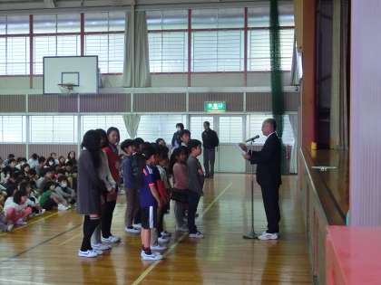 朝会 公開日 2015/11/09 更新日 2015/11/09 学校の様子 本日は朝会を行いました。いつもは外で行いますが、今日は雨天のため体育館での朝会となりました。表彰伝達、校長先生の話、連絡事項の内容です。子どもたちの司会で進みますが、いつも総務委員がしっかりやってくれます。
