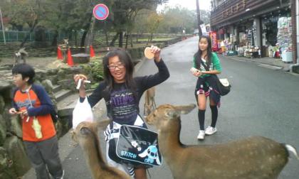 修学旅行 東大寺 公開日 2008/11/07 更新日 2008/11/07 学校の様子 奈良に到着しました。 たくさんの鹿の歓迎を受けながら、東大寺の大仏殿へと向かいました。大きな奈良の大仏さんを見学するところから、昼食をとる白銀屋さんまでは、班行動です。 早い班は11時前に白銀屋さんに到着したので、今、鹿と戯れています。