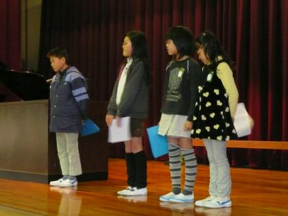 2学期終業式 公開日 2008/12/22 更新日 2008/12/22 学校の様子 12月22日(月)に、体育館で2学期の終業式がありました。校長先生から2学期の反省として、「挨拶がよくできたこと」や「運動場で元気よく遊べたこと」をほめていただきました。その後、2年生と5年生から「2学期にがんばったこと」を報告してもらいました。どの子も一生懸命がんばったことを、しっかりと報告することができました。