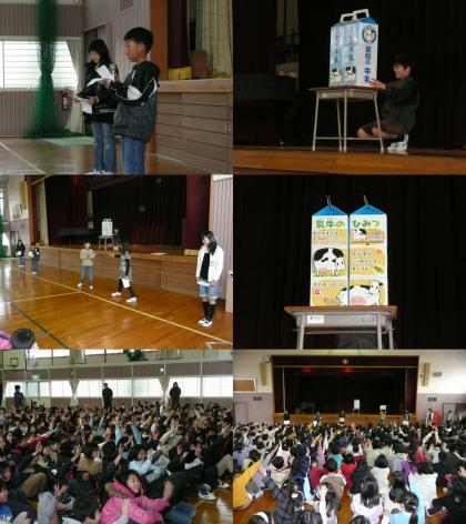 給食委員会の発表 公開日 2009/02/10 更新日 2009/02/10 学校の様子 2月9日(月)の朝会で、給食委員会が牛乳についての発表を行いました。クイズ形式にして、みんなに答えてもらいながら、牛乳を飲むとどんな効果があるかをわかりやすく説明してもらいました。寒くてもがんばって牛乳を飲もうとみんな思いました。