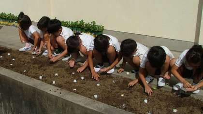 2年生が生活科の授業でダイコンの種を植えました。教室の前にある花壇に一人づつていねいに種を植えていました。早く芽を出し大きなダイコンが収穫できるといいですね。生長の様子をよく観察してくださいね。