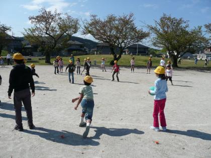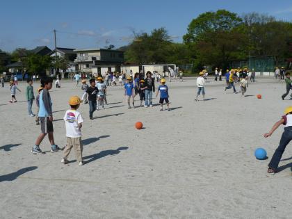 お兄さんやお姉さんのリードで、運動場や緑山のてっぺんにひろがって、ボール遊びやはじめの一歩などをしました。