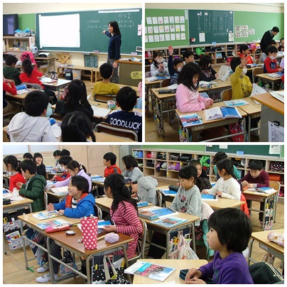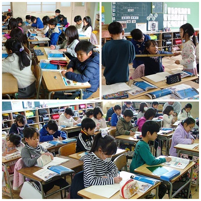 2年生の3時間目は2クラスとも算数の授業でした。「100cmをこえる長さ」の単元の学習で、メートルの単位の導入の授業です。挿絵のジンベイザメの長さを予想していましたが、子どもたちの長さの感覚は大人とは違うようでした。友達同士で両手を広げた長さを測って長さの感覚を養っていました。