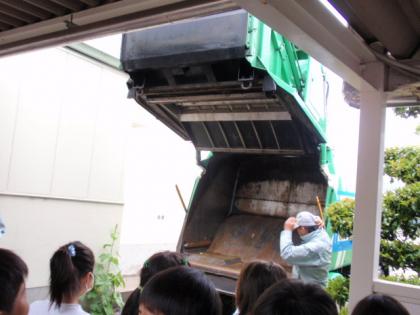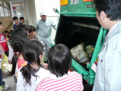 パッカー車 体験 公開日 2009/05/09 更新日 2009/05/09 学校の様子 5月7日(木)4年生は、社会科の学習で、「青空(?)教室」を行いました。 あいにくの雨模様でしたが、体育館の渡り廊下を使って学習をしました。 このときのために、各自家庭からごみを持って登校し、市の職員の方の説明を聞いた後、実際にパッカー車にごみを入れる体験をしました。 これからは、ごみの処理に関心を持って、分別できるようになったことでしょう。