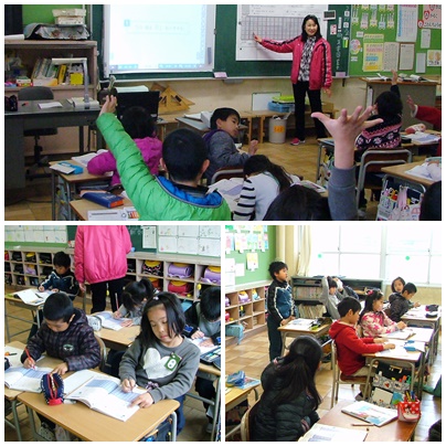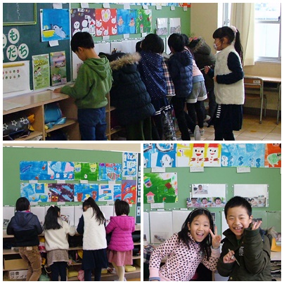 2時間目の2年生の授業の様子です。1組は図工の作品鑑賞です。掲示板に貼ってある友達の作品を鑑賞して、感想を書いていました。2組は算数で1000を超える大きな数についての学習です。先生の問に大きな声で「ハーイ」と言って手を挙げていました。