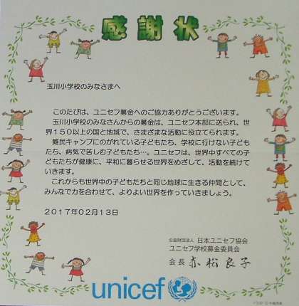 ユニセフ募金へのご協力ありがとうございました 公開日 2017/02/23 更新日 2017/02/23 学校の様子 先日ユニセフ募金を行いましたが、4日間で28,298円の募金が集まりました。たくさんの皆様にご協力いただき、ありがとうございました。集まった募金は日本ユニセフ協会へ送金しましたが、本日感謝状をいただきました。