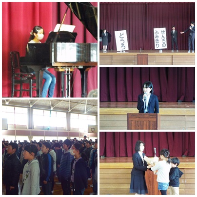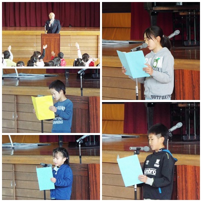 平成28年度 修了式 公開日 2017/03/24 更新日 2017/03/24 学校の様子 平成28年度修了式を行いました。各学年の代表が修了証を受け取り校長先生のお話の後、4年生と1年生の代表が3学期を振り返って、がんばったことや新年度への抱負を発表しました。明日からは子どもたちは春休みに入ります。交通事故には絶対にあわないように安全な春休みを過ごし、始業式には全員が元気よく笑顔で登校できるようにしてくださいね。