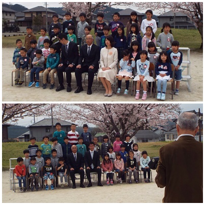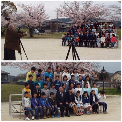 学級写真を撮影しました。全員が位置を決めて、瞬きを我慢したり動きを止めたりすることは結構大変です。特に低学年の子どもたちは、シャッターチャンスが難しいですね。今日は桜が満開で、いい背景になりました。