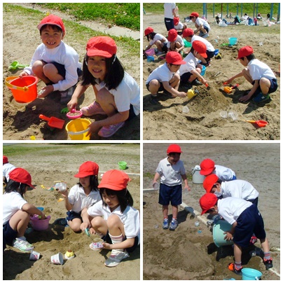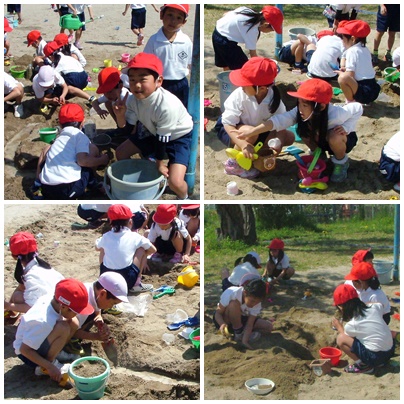 1年生が砂場遊びを行いました。今日はよく晴れて風が爽やかで、みんな気持ちよさそうです。山や島を作ったり穴を掘ったり、水を流している子もたくさんいました。みんなそれぞれに協力して作品?作りを楽しんでいました。仲間と遊ぶ楽しさが味わえたのではないでしょうか。