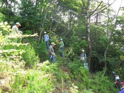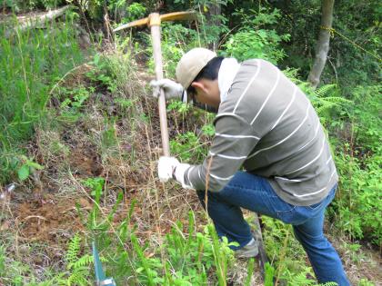 けれども、植樹の場所は、なだらかなところではなく、山の中腹の崖になっているところです。草が生え、枝が飛び出ているのを、お父さんやお母さん、この植樹をお世話してくださっているみろくの会のみなさん、そして先生方のお力で、耕したり枝払いをしたりと、たいへんお世話になりました。