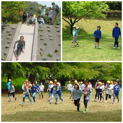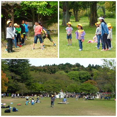 春の遠足、自由時間の様子です。弁当を食べた後は自由時間です。1時間30分くらいでしたが、子どもたちは思い思いに園内を走り回っていました。