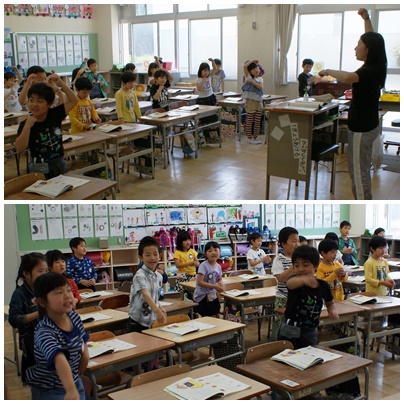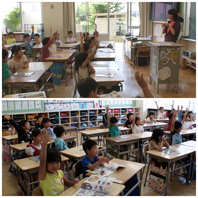 2時間目、1年生の授業の様子です。1組は図工「あったらいいなとおもう じぶんだけのたいようをかこう」の内容で、自分が想像するいろいろな太陽を考えていました。2組は国語で「さる」と「ざる」のように、ひらがなに点が付くと全く違う意味になってしまう言葉について学習していました。一年生らしく活気のある授業でした。