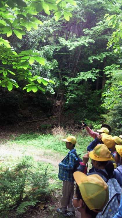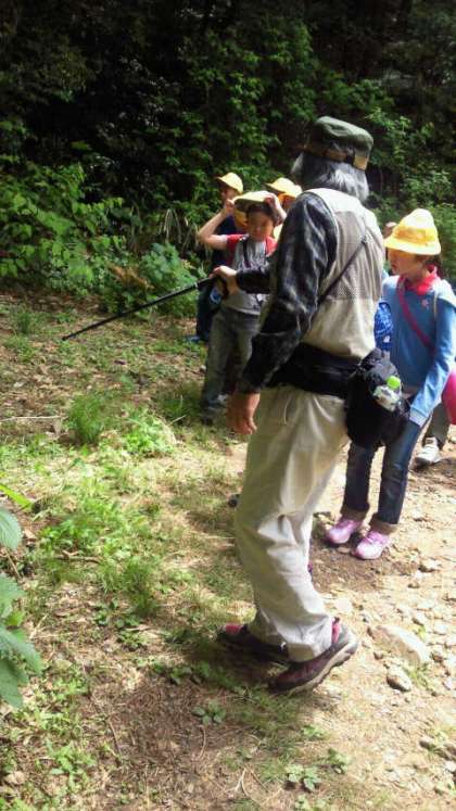 ガイドの先生から山の自然について説明をうけながらハイキング中です。