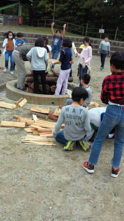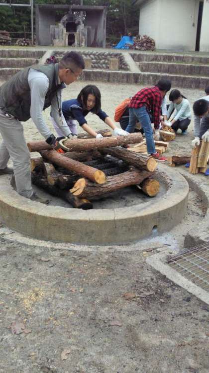 実行委員のファイヤー部がキャンプファイヤーの準備を頑張っています。