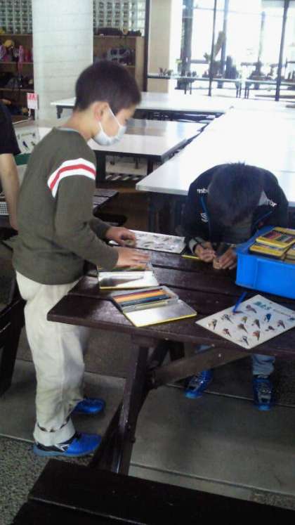 バードコールには自分のお気に入りの絵を書いたり、スタンプをおしたりして仕上げます。