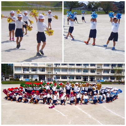 低学年の音遊の練習の様子です。練習も進んでいるので、もう音楽に合わせて踊れるようになっています。キラキラのカラフルなポンポンを持って踊ります。演技名は「友よ〜この先もずっと〜」です。本番をお楽しみに。
