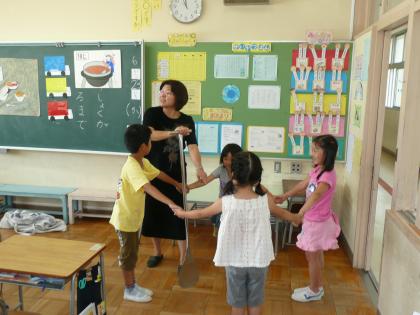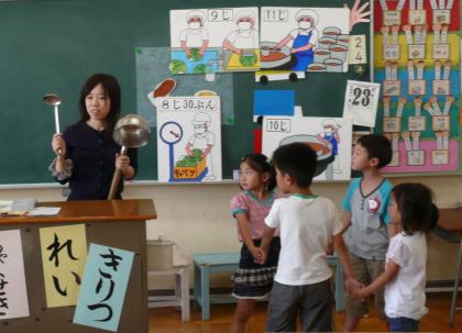 4時間目に、1年生の2クラスで、給食のお話です。