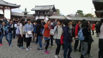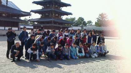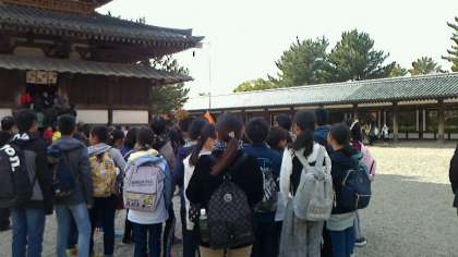 予定通りに法隆寺に到着し、みんなで見学しています。歴史的な建造物の大きさや風格に感動です。