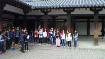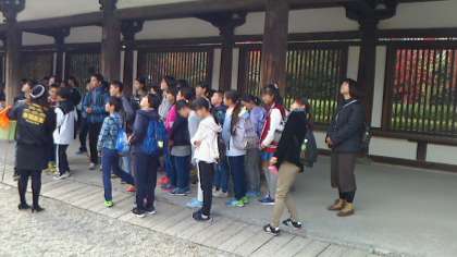 ガイドさんの説明を聞きながら、法隆寺の五重塔を見学しています。