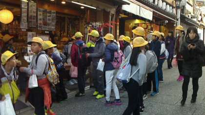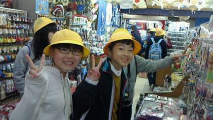 買い物中です。まだお店が全部開いていませんが、子どもたちは楽しそうにお土産を選んでいます。