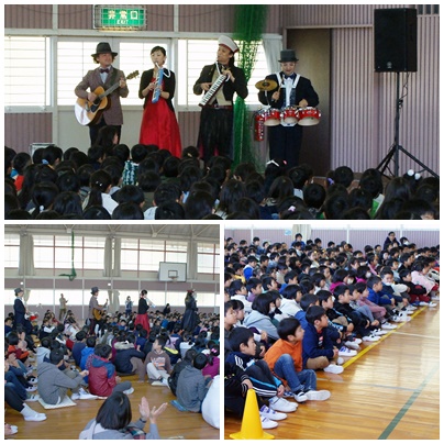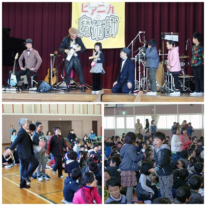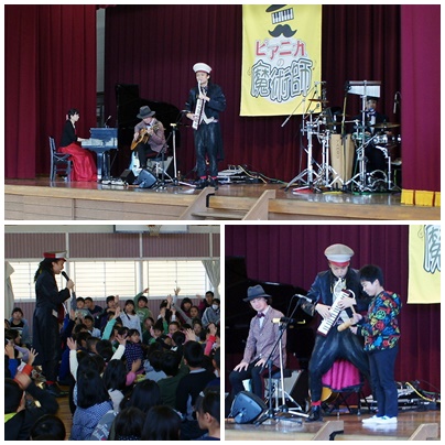 親子芸術鑑賞会 公開日 2017/11/27 更新日 2017/11/27 学校の様子 親子芸術鑑賞会で「ピアニカの魔術師」を鑑賞しました。普段子どもたちが音楽の授業で使っているピアニカを使って、いろいろな曲を演奏していただきました。それにしてもピアニカで演奏するのにいろいろな技があるのには驚きました。子どもたちは興味深そうに聞いていましたので、自分で試してみるのではないでしょうか。みんなで歌ったり踊ったりもして楽しい時間を過ごすことができました。