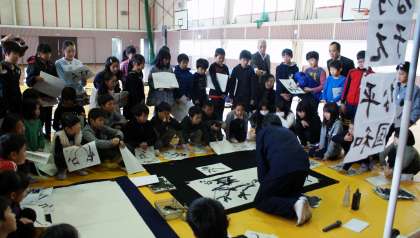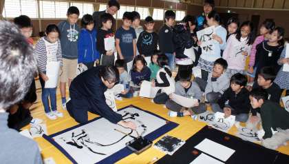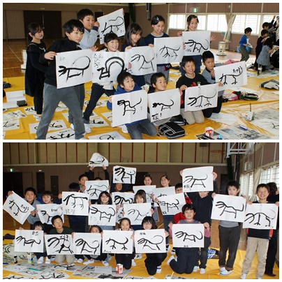 あーとふるマイタウン「おもしろいで書」 1 公開日 2017/11/29 更新日 2017/11/29 学校の様子 あ〜とふるマイタウン事業として書道家の原田凍谷先生に、4年生が「おもしろいで書」の授業をしていただきました。美しい字のお手本や漢字の成り立ちについて、実際に書きながら教えていただきました。先生の迷いのない筆使いに子どもたちは驚いていました。先生のお手本の後自分たちで風や犬を書で表現して、書に親しむことができたと思います。