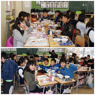 5年生の給食の様子です。明るく元気な子どもたちです。食欲も旺盛です。今日のメニューは、ごはん、牛乳、みそおでん、わかさぎの南蛮漬け、カットオレンジでした。