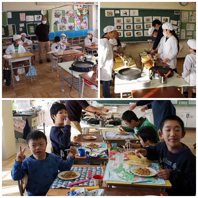 調理実習 5・6組 公開日 2017/12/13 更新日 2017/12/13 学校の様子 5・6組が調理実習を行いました。学校の畑で作ったキャベツとニンジンを使って焼きそばを作りました。みんなで手分けして野菜を切り炒めて作った焼きそばは、とてもおいしかったですね。