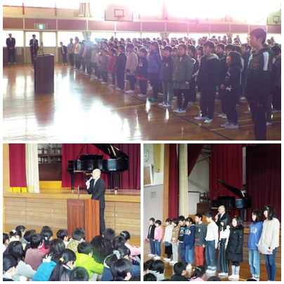 三学期始業式を行いました。学校に子どもたちの元気な声が戻ってきました。短い三学期ですが、学年を締めくくる大切な学期です。やるべきことに一生懸命に取り組んでください。寒い時期ですが放課は運動場で元気よく遊び、体育の時間は元気よく体を動かして、寒さに負けない丈夫な体と心を作ってほしいと思います。三学期もがんばりましょう。