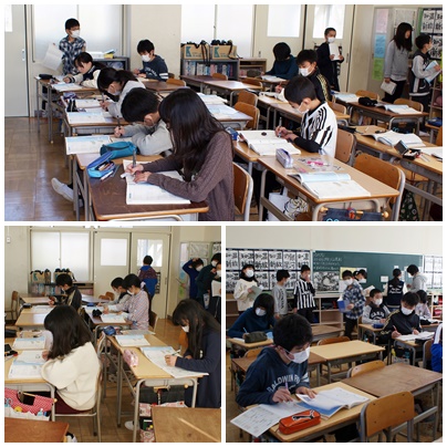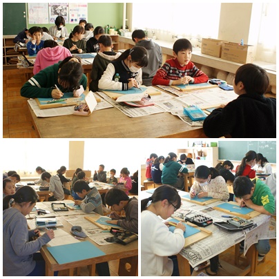 3時間目の6年生の授業の様子です。1組は図工で版画の制作を、2組は算数で単位についてのまとめの問題を解いていました。みんな真剣に取り組んでいます。