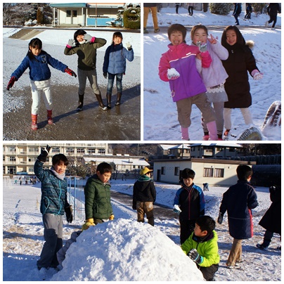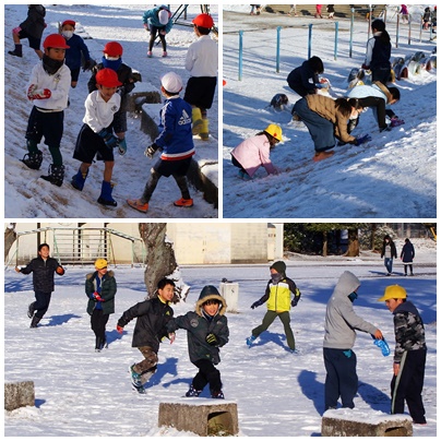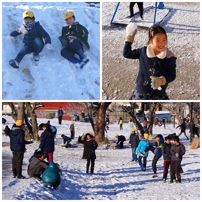 雪遊び 公開日 2018/01/25 更新日 2018/01/25 学校の様子 今朝は、昨日降った雪で校庭が一面真っ白に雪化粧です。玉川小学校の積雪は5cmほどでした。交通機関にとっては厄介な雪ですが、子どもたちにとっては楽しい雪です。朝放課から1時間目も多くのクラスが運動場で雪遊びを楽しんでいました。