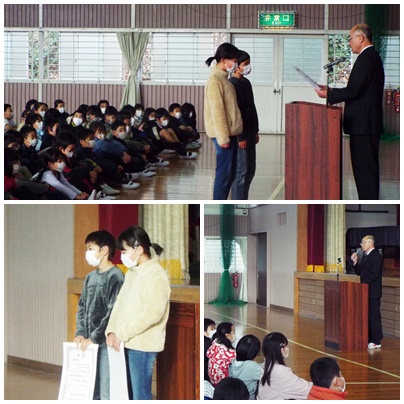朝会を行いました。読書感想文の表彰伝達の後、校長先生のお話を聞きました。インフルエンザの欠席者が多く感染の心配があるので、全員マスク着用で行いました。今週は学習発表会があります。一年間の成長を感じることができる学習発表会にしてほしいと思います。