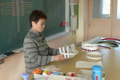 岩成台小学校の元校長先生・佐治昌子先生に教えていただきながら、紙ひもでかごを編みました。