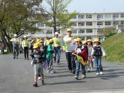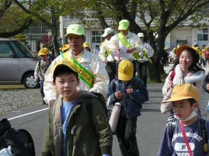 4月19日(月)、一斉下校時に、ボニターの皆さん約20名に集まっていただき、子どもたちに交通安全を願う気持ちを伝えていただきました。その後ボニターの皆さんには通学団に分かれて、通学路の安全点検をしていただきました。