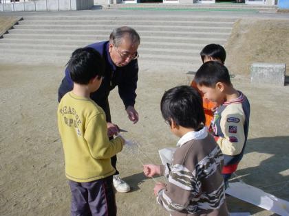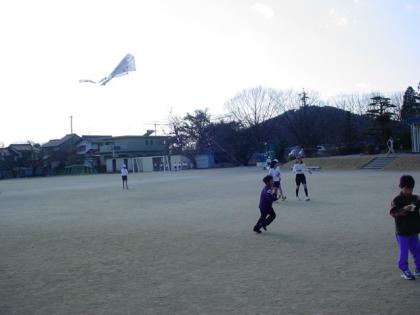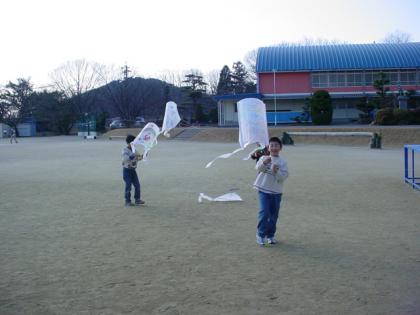 「あっ!少し風が出てきた!たこあげをしよう!」と、手作りたこを手に運動場にくり出しました。うまくあがったりあがらなかったり。担任の先生と校長先生はもつれたたこ糸をほどくのに、大忙しでした。それでも空に自分の描いた絵だこがあがった時は、満面の笑顔の1年生でした。