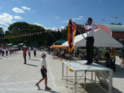 9月25日(土)、閉会式では、白組の応援団長へ校長先生から優勝旗が手渡されました。勝った白組からは、「ばんざ〜い」の声、負けた赤組からも大きな拍手が贈られました。また、生活班競技「いもむし なかよし のっそのそ」では入賞した生活班に子どもたちでつくった生活班競技実行委員の代表から賞状をもらいました。