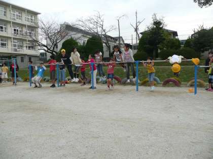 子どもたちは、早速新しい鉄棒に飛びついて、クルリン、クルリンと鉄棒運動を楽しみました。