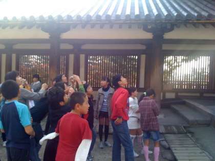修学旅行その20 公開日 2010/11/12 更新日 2010/11/12 学校の様子 法隆寺の説明を聞きながらの見学です。本当に立派な建物です。法隆寺を予定とおり出発しています。学校への帰着時間は「亀山サービスエリア」からの連絡を待ってお知らせします。