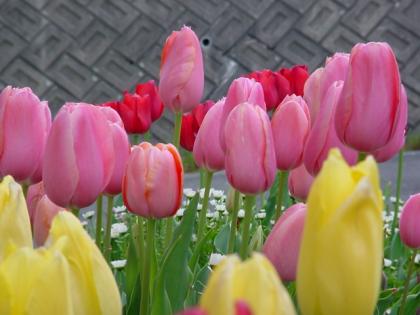 春の花壇には色とりどりの花が咲き乱れています。