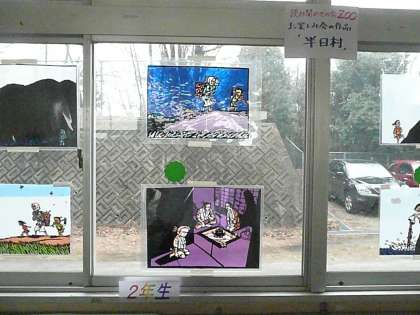 ZOOさん作品掲示 公開日 2011/02/18 更新日 2011/02/18 学校の様子 2月16日(水)毎年楽しみにしている読み聞かせグループ「ZOO」さんのお楽しみ会がありました。今年は、「半日村」を読んでいただきましたが、その時使いましたステンドグラスの原画を1階昇降口の窓ガラスに掲示していただきました。映像で見るのとはまた違った感動を味わえます。しばらくの間掲示しますので楽しんでください。