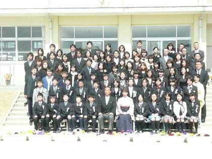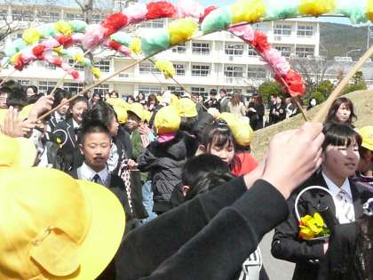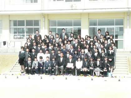 卒業式その3 公開日 2011/03/18 更新日 2011/03/18 学校の様子 卒業式も無事終わり、学級で担任の先生とのお別れをすませた卒業生が外に出てきましたので、恒例の記念撮影と、巣立ちを見守りました。6年間の思いがたくさん詰まった玉川小ともお別れです。卒業生の皆さん、希望を持って、前進していってください。おめでとうございました。