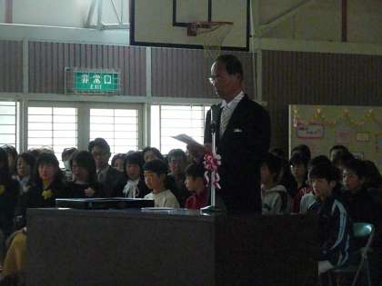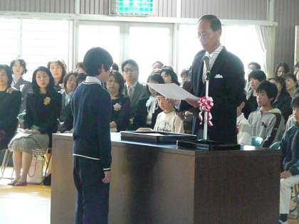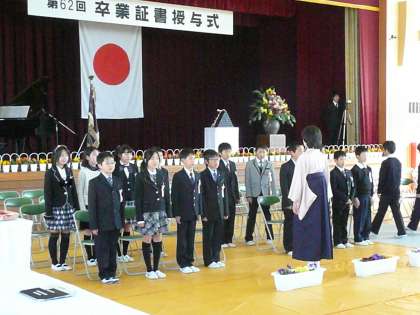 卒業式では、全員に一人一人卒業証書を手渡し、その後学校長の式辞に中で、「夢や志を持って生きよう。」「人としての思いやりの心を持った人になろう。」という2点がはなむけの言葉として贈られました。卒業生の心にしみ込んだと思っています。