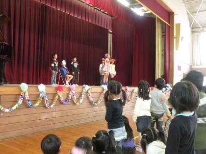5,6年生の総務委員の皆さんが、寸劇で学校生活の様子やなかよく、楽しい